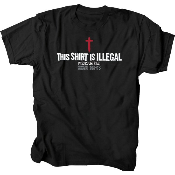 100% preshrunk cotton 5.4 oz t-shirt. Black Loose fitting basic tee. This Christian message tee is part of the ILLEGAL® Collection designed to promote The Voice of the Martyrs . Visit www.persecution.com to learn more. Warning: For now the US is a safe place to wear this shirt. Be on alert. This Christian message tee was the first Gardenfire design back in 2007. Illegal continues to be the star of our line.